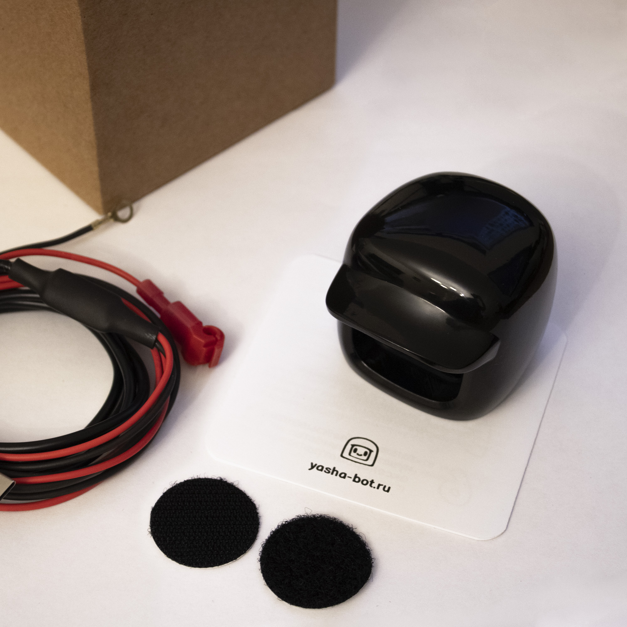 Сам Яша, стикер-липучка для его установки и инструкция. Провода в комплекте нет, адаптер от бортовой сети автомобиля - опционально.
